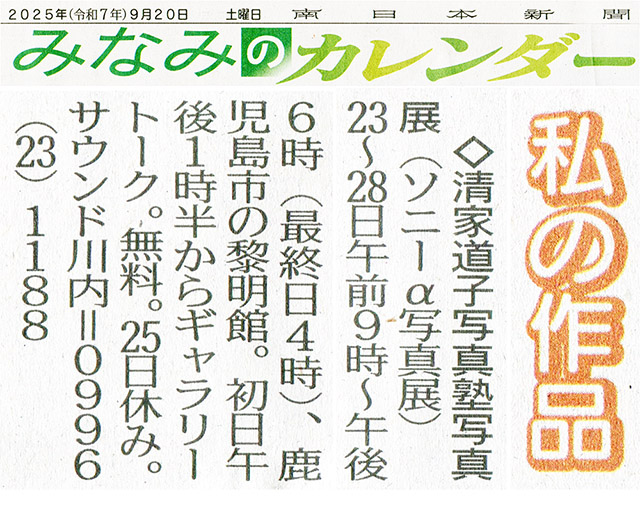 2025年9月21日 写真展の案内を南日本新聞(みなみのカレンダー)に掲載いただきました。 soundsendai お知らせ, ブログ, 写真展 0 Comments 写真展の案内を南日本新聞(みなみのカレンダー)に 掲載いただきました。 お預かりしている皆さんの写真の額装や道具のチェックや いろいろな準備の確認作業中です。 いよいよ明日(22日)搬入(展示作業)です。 Tweet