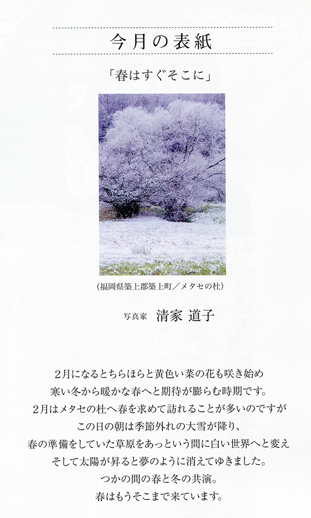 2026年1月15日 九州王国2月号表紙写真は「春はすぐそこに」 soundsendai お知らせ, ブログ 0 Comments 九州王国2月号表紙写真は「春はすぐそこに」 撮影場所・福岡県築上郡築上町(メタセの杜) 撮影・清家道子氏(写真家) Tweet
