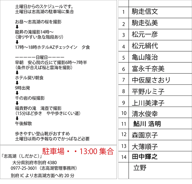 2026年4月1日 「清家道子写真塾」撮影会の件 soundsendai お知らせ, ブログ 0 Comments 「清家道子写真塾」撮影会の件 撮影会日程・・2026年4月4日(土)~5日(日) 集合場所(4月4日) 志高湖(しだかこ)駐車場 大分県別府市東山4380 集合時間 13:00 道中くれぐれも気を付けてお越しください。 Tweet