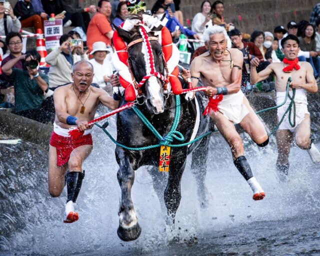 水しぶきを上げて豪快に走り抜ける馬追いの様子は圧巻。