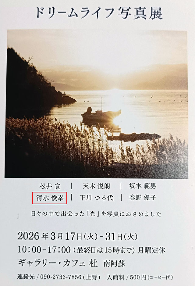 2026年3月29日 ドリームライフ写真展 soundsendai お知らせ, ブログ 0 Comments ドリームライフ写真展 会期・2026年3月31日(火)まで 月曜日定休 (10:00~17:00 最終日15:00まで) 会場・ギャラリー・カフェ杜南阿蘇 (阿蘇郡南阿蘇村大字吉田48-3) 皆さんそれぞれ個性の分かる素晴らしい写真展でした。 Tweet