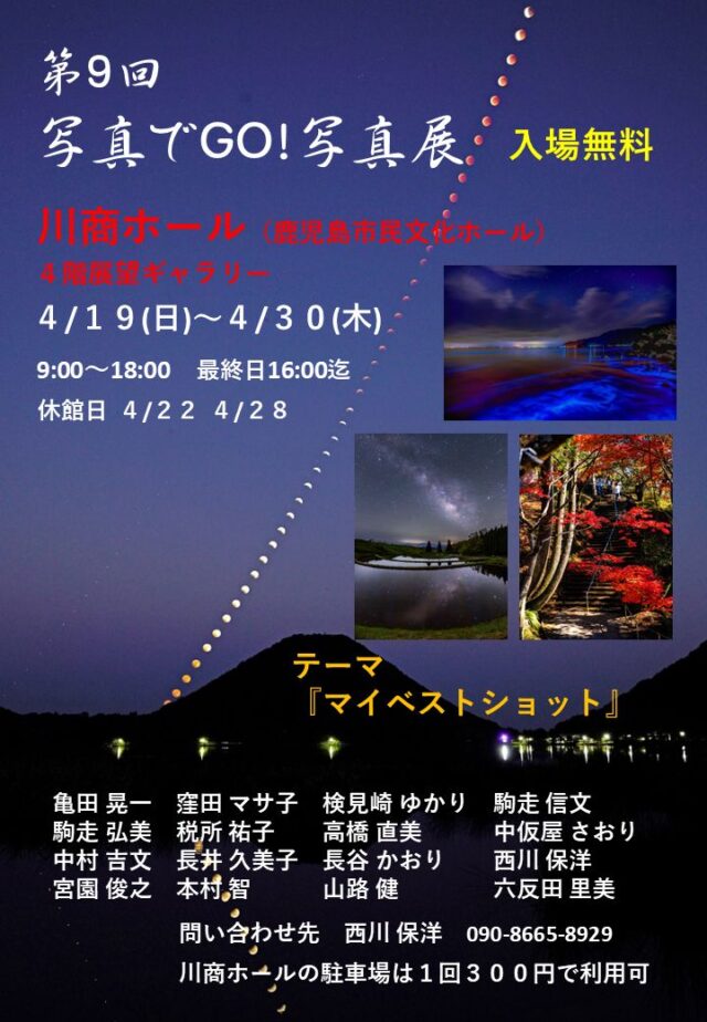 2026年3月27日 写真展のご案内。 soundsendai お知らせ, ブログ 0 Comments 第9回写真でGO!写真展 会期・2026年4月19日(日)~4月30日(木) (9:00~18:00 最終日は16:00まで) 休館・22日(水)・28日(火) 会場・川商ホール(鹿児島市民文化ホール) (鹿児島市2丁目3番1号・・099-257-8111) 入場無料 Tweet