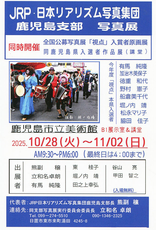 2025年10月29日 JRP・日本リアリズム写真集団鹿児島支部写真展は開催中です。 soundsendai お知らせ, ブログ 0 Comments JRP・日本リアリズム写真集団鹿児島支部写真展 会期・2025年10月28日(火)~11月2日(日) (9:30~18:00 最終日 16:00) 会場・鹿児島市立美術館 地階展示ロビー・講堂 (鹿児島市城山町4-36 099-224-3400) 同時開催 全国公募写真展「視点」入賞者原画展 同鹿児島入選者作品展(講堂) 入場無料 Tweet