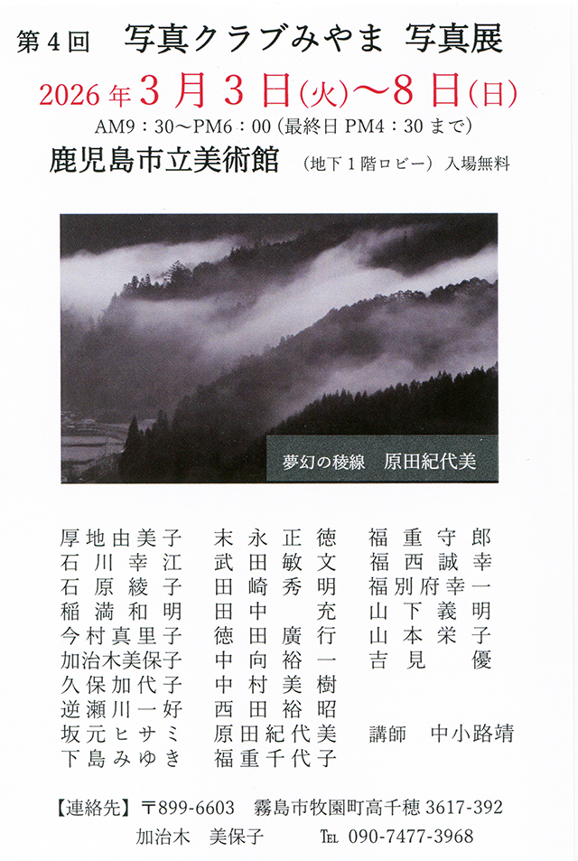 2026年2月18日 写真展のご案内 soundsendai お知らせ, ブログ, 未分類 0 Comments 第4回 写真クラブみやま写真展 会期 2026年3月3日(火)~8日(日) am9:30~pm6:00 (最終日 pm4:30) 会場 鹿児島市立美術館(地下展示ロビー) (鹿児島市城山町4-36) 入場無料 Tweet