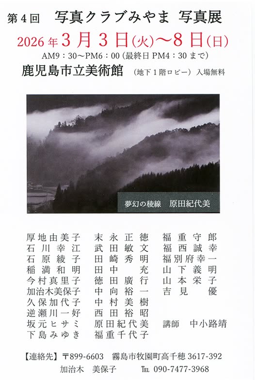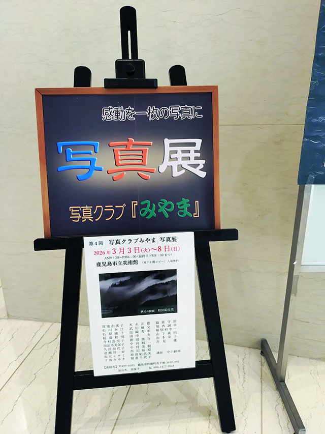 2026年3月3日 第4回 写真クラブみやま写真展は本日から soundsendai お知らせ, ブログ 0 Comments 第4回 写真クラブみやま写真展は本日から 会期 2026年3月3日(火)~8日(日) am9:30~pm6:00 (最終日 pm4:30) 会場 鹿児島市立美術館(地下展示ロビー) (鹿児島市城山町4-36) 入場無料 Tweet