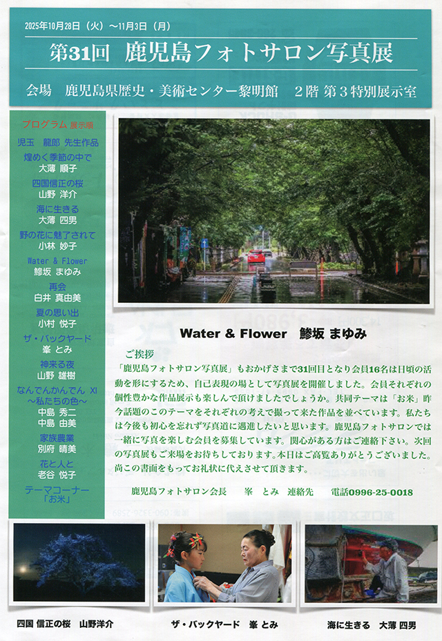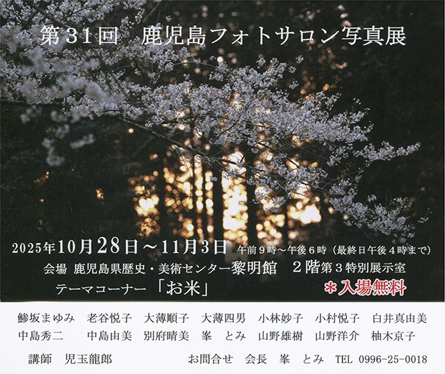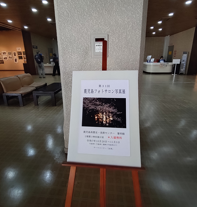 2025年10月29日 第31回鹿児島フォトサロン写真展開催中です。 soundsendai お知らせ, ブログ 0 Comments 第31回鹿児島フォトサロン写真展開催中です。 会期・2025年10月28日(火)~11月3日(月) (9:00~18:00 最終日16:00) 会場・鹿児島県歴史・美術センター黎明館(2階第3特別展示室) (鹿児島市城山町7-2) 入場無料 現在、鹿児島県歴史・美術センター黎明館の1階で 鹿児島県写真協会合同写真展が開催中です。 鹿児島フォトサロン写真展は2階第3特別展示室にて開催中です。 Tweet