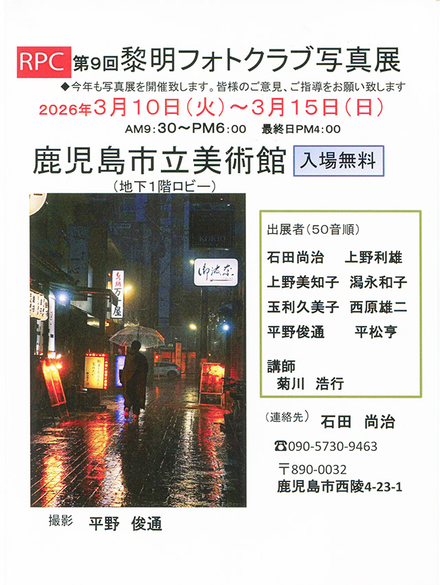 2026年3月10日 第9回黎明フォトクラブ写真展は本日から soundsendai お知らせ, ブログ, 未分類 0 Comments 第9回黎明フォトクラブ写真展 会期 2026年3月10日(火)~15日(日) am 9:30~pm 6:00 最終日pm 4:00 会場 鹿児島市立美術館(地下展示ロビー) (鹿児島市城山町4-36) 入場無料 Tweet