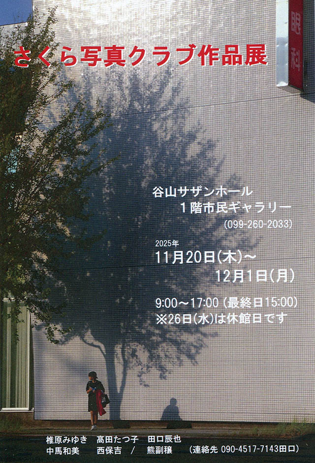 2025年10月22日 さくら写真クラブ作品展 soundsendai お知らせ, ブログ 0 Comments さくら写真クラブ作品展 会期・2025年11月20日(木)~12月1日(月) (26日(水)は休館日です) 9:00~17:00(最終日は15:00まで) 会場・谷山サザンホール 1階市民ギャラリー (鹿児島市谷山中央1丁目4360 099-260-2033) 入場無料 出展者 椎原みゆき 高田たつ子 田口辰也 中馬和美 西保吉 熊副 穣 Tweet