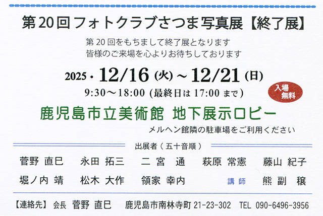2025年11月28日 第20回フォトクラブさつま写真展「終了展」 soundsendai お知らせ, ブログ 0 Comments 第20回フォトクラブさつま写真展「終了展」 会期・2025年12月16日(火)~12月21日(日) (9:30~18:00 最終日は17:00まで) 会場 鹿児島市立美術館(地下展示ロビー) (鹿児島市城山町4-36 099-224-3400) 入場無料 今回が終了展です。 Tweet