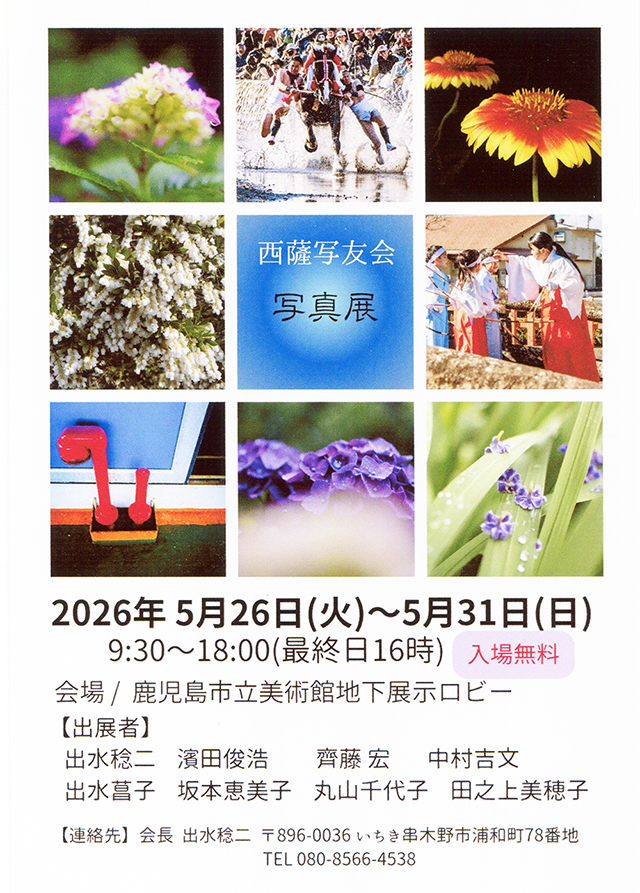 2026年4月13日 写真展のご案内。 soundsendai お知らせ, ブログ 0 Comments 西薩写友会写真展のご案内 会期・ 2026年5月26日(火)~31日(日) (9:30~18:00 最終日は16:00まで) 会場・ 鹿児島市立美術館 地階 展示ロビー (鹿児島市城山町4-36 099-244-3400) 入場無料 Tweet