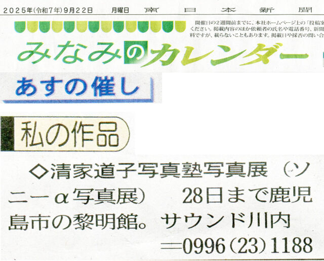 2025年9月22日 「清家道子写真塾」写真展(ソニーα写真展)準備が終わりました。 soundsendai お知らせ, ブログ, 写真展 0 Comments 「清家道子写真塾」写真展(ソニーα写真展)準備が 終わりました 本日皆さんに9:30にご集合いただき初めての会場でしたが 手際よく作業が進みお昼過ぎに終わりました。 後はソニーさんのご協力をいただいて照明の調整をして 無事準備が終わりました。 明日は清家先生のギャラリートーク(13:30)もございます。 皆様のご来観をお持ち申し上げております。 Tweet