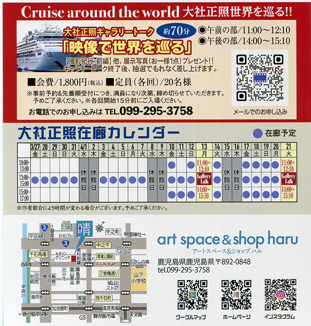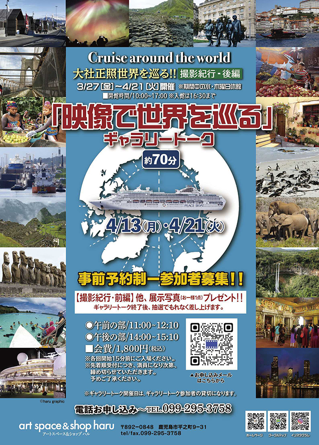2026年3月21日 写真展「大社正照世界を巡る!!撮影紀行・後編」 soundsendai お知らせ, ブログ 0 Comments 写真展「大社正照世界を巡る!!撮影紀行・後編」 会期・3月27日(金)~4月21日(火) (10:00~17:00) 毎週 水・木曜日は休館 会場・art space&shop haru(アート スペース アンド ショップ ハル) (鹿児島市平之町9-31 099-295-3758 Tweet