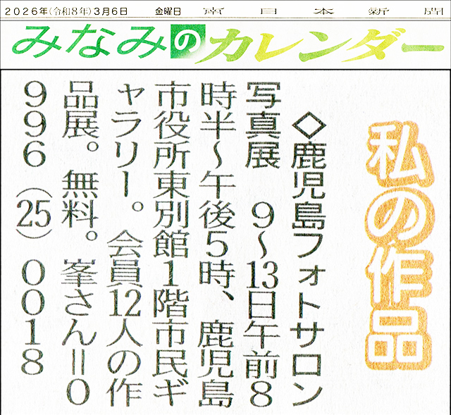 2026年3月10日 鹿児島フォトサロン写真展 soundsendai お知らせ, ブログ, 未分類 0 Comments 鹿児島フォトサロン写真展 会期 2026年3月9日(月)~13日(金) (am8:30~pm5:00) 会場 鹿児島市役所 別館1階市民ギャラリー 入場無料 会場は東別館ではなく別館1階市民ギャラリーです。 ご注意ください。 Tweet