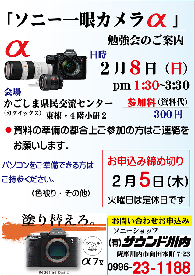 2026年1月12日 「ソニー一眼カメラα」勉強会のご案内 soundsendai セミナー, ブログ 0 Comments 「ソニー一眼カメラα」勉強会のご案内 日時 2月8日(日) pm1:30~3:30 会場 かごしま(カクイックス)県民交流センター (東棟・4階・小研2) 参加料(資料代) 300円 申込締め切り 2月5日(木) お申し込みは 0996-23-1188 ご都合の良い方はパソコンをご持参ください。 Tweet