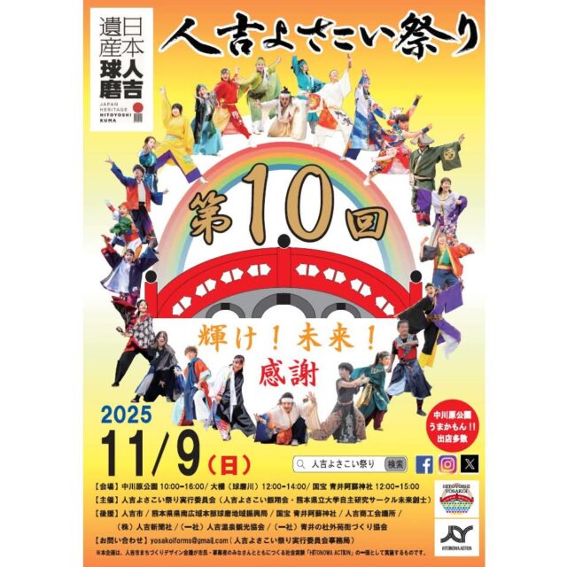 2025年11月1日 第10回 人吉よさこい祭り soundsendai お知らせ, ブログ 0 Comments 第10回 人吉よさこい祭り 中川原公園をメインに、大橋や青井阿蘇神社で演舞。 開催日:令和7年11月9日(日) 📍会場(開催時間) ・中川原公園(午前10時~午後4時) ・大橋(正午~午後2時) ・青井阿蘇神社(正午~午後3時) Tweet